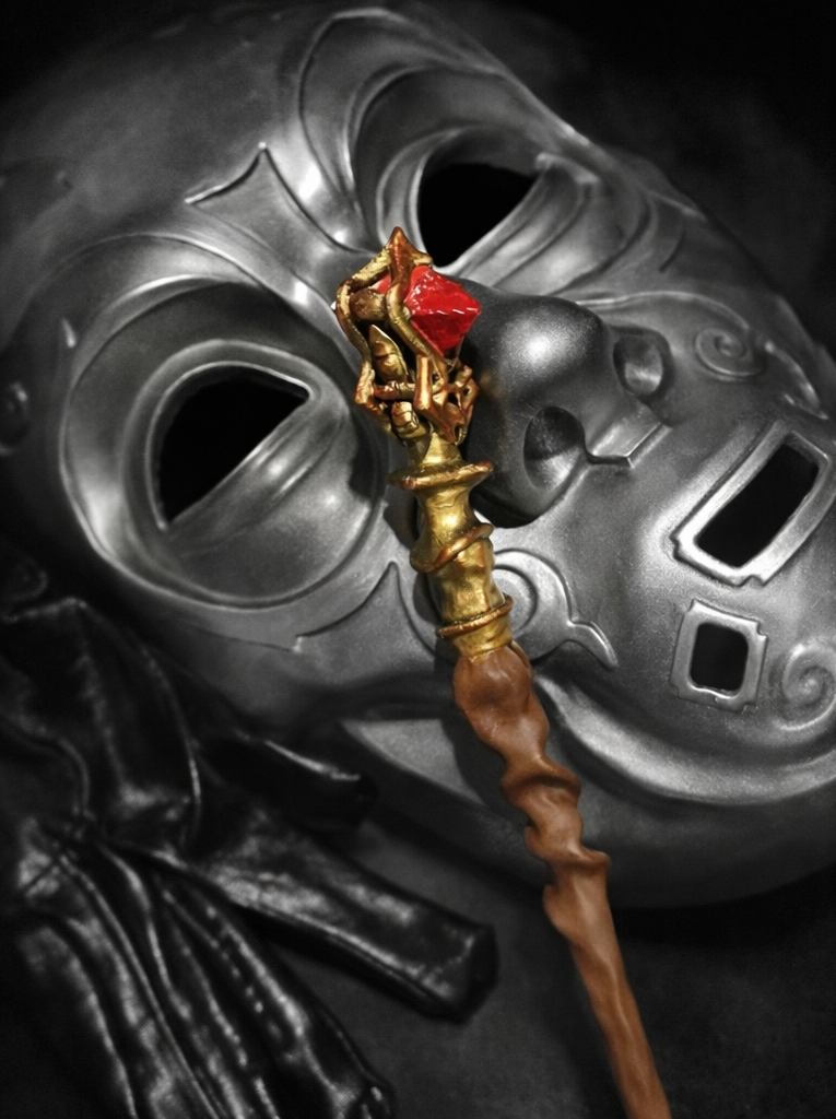 Son manche sculpté présente des formes organiques et irrégulières, donnant l'impression qu'elle a ét façonnée par la magie elle-même. La partie supérieure est ornée d'une structure dorée et bronze complexe renfermant une pierre rouge mystique, symbole de puissance et de maîtrise.