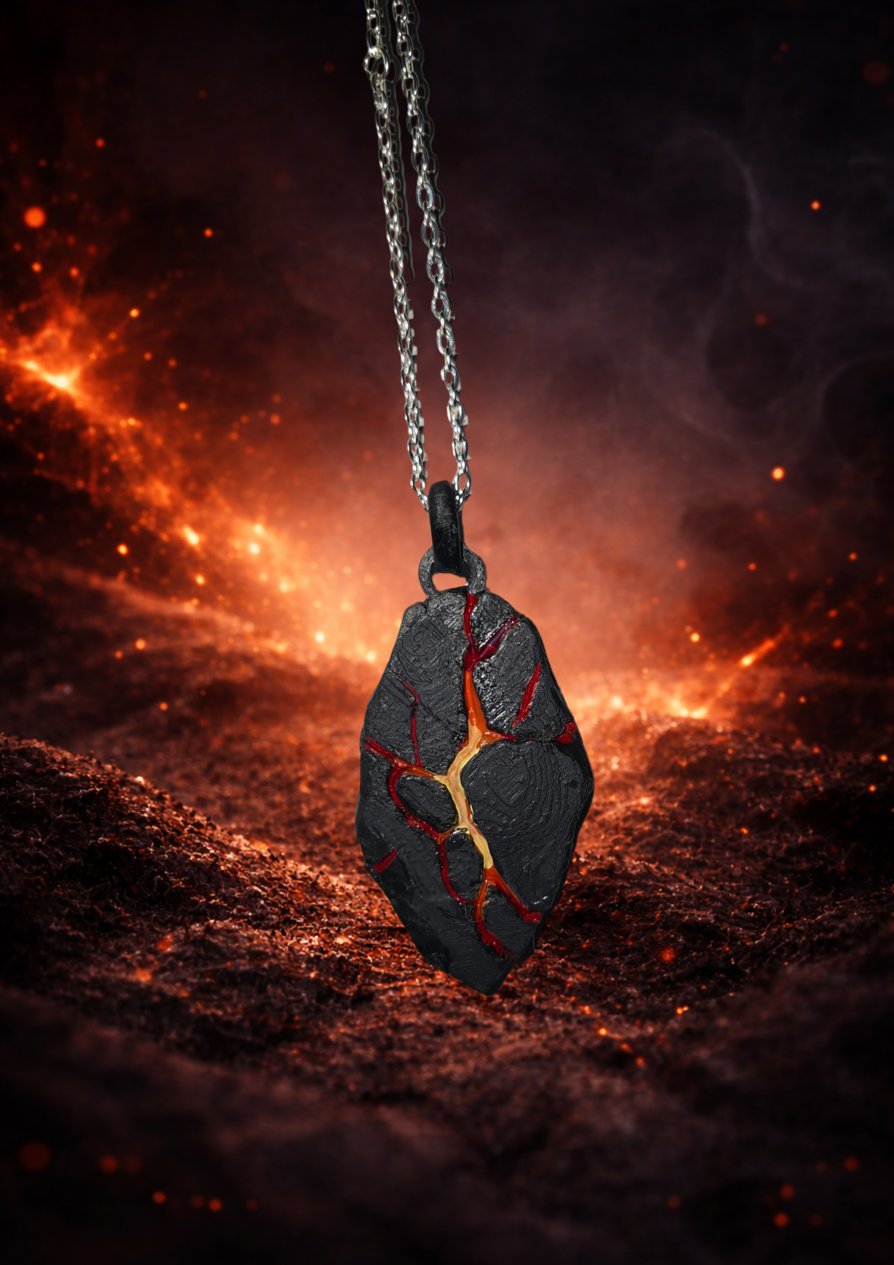 Arraché aux profondeurs, le pendentif Cœur de Magma capture la puissance d’une roche en fusion figée dans le temps.