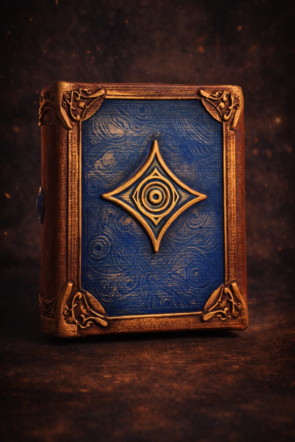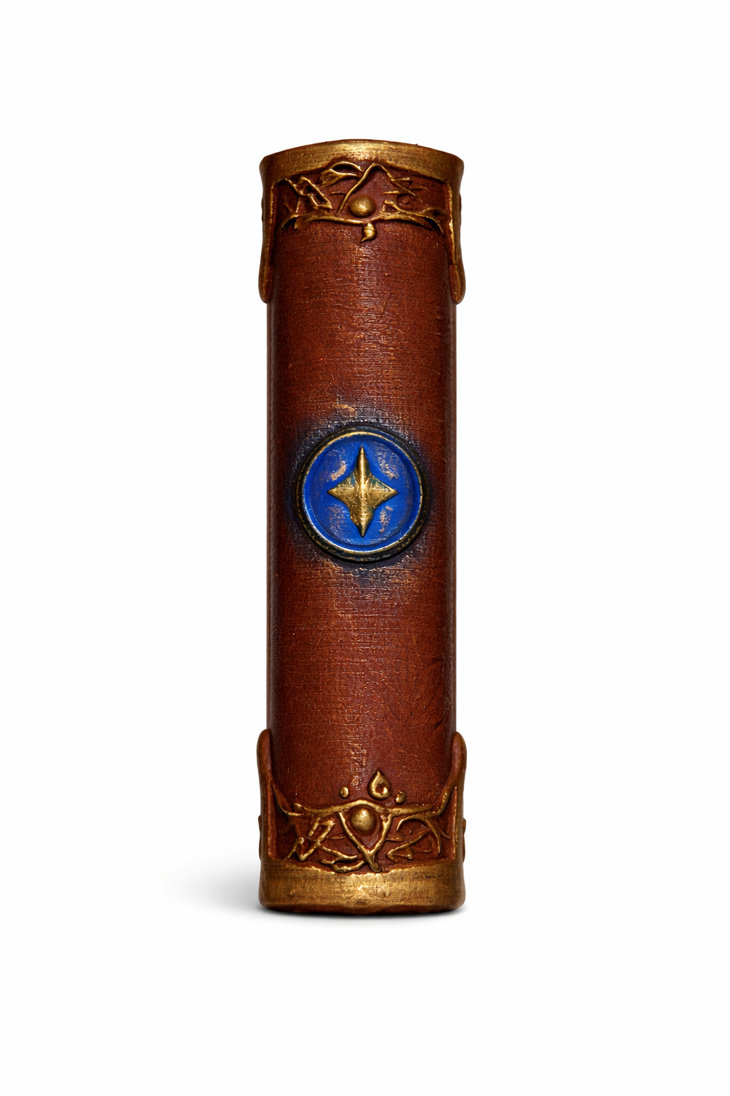 Chaque pièce est imprimée puis peinte à la main, avec un travail minutieux sur les textures pour imiter un cuir ancien et des dorures vieillies. Le symbole central et les détails gravés donnent l’impression d’un véritable artefact magique.