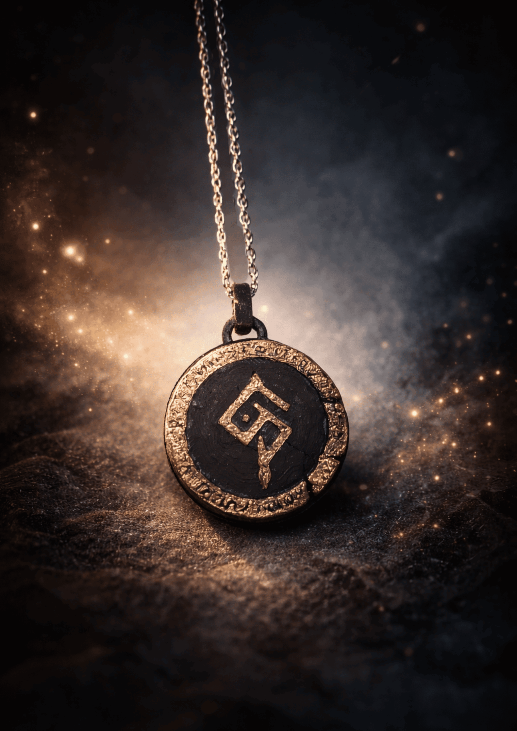 Son design circulaire encadre une rune centrale gravée, comme un signe dont la signification s’est perdue, mais dont la présence reste forte. Les effets de peinture donnent un aspect vieilli.